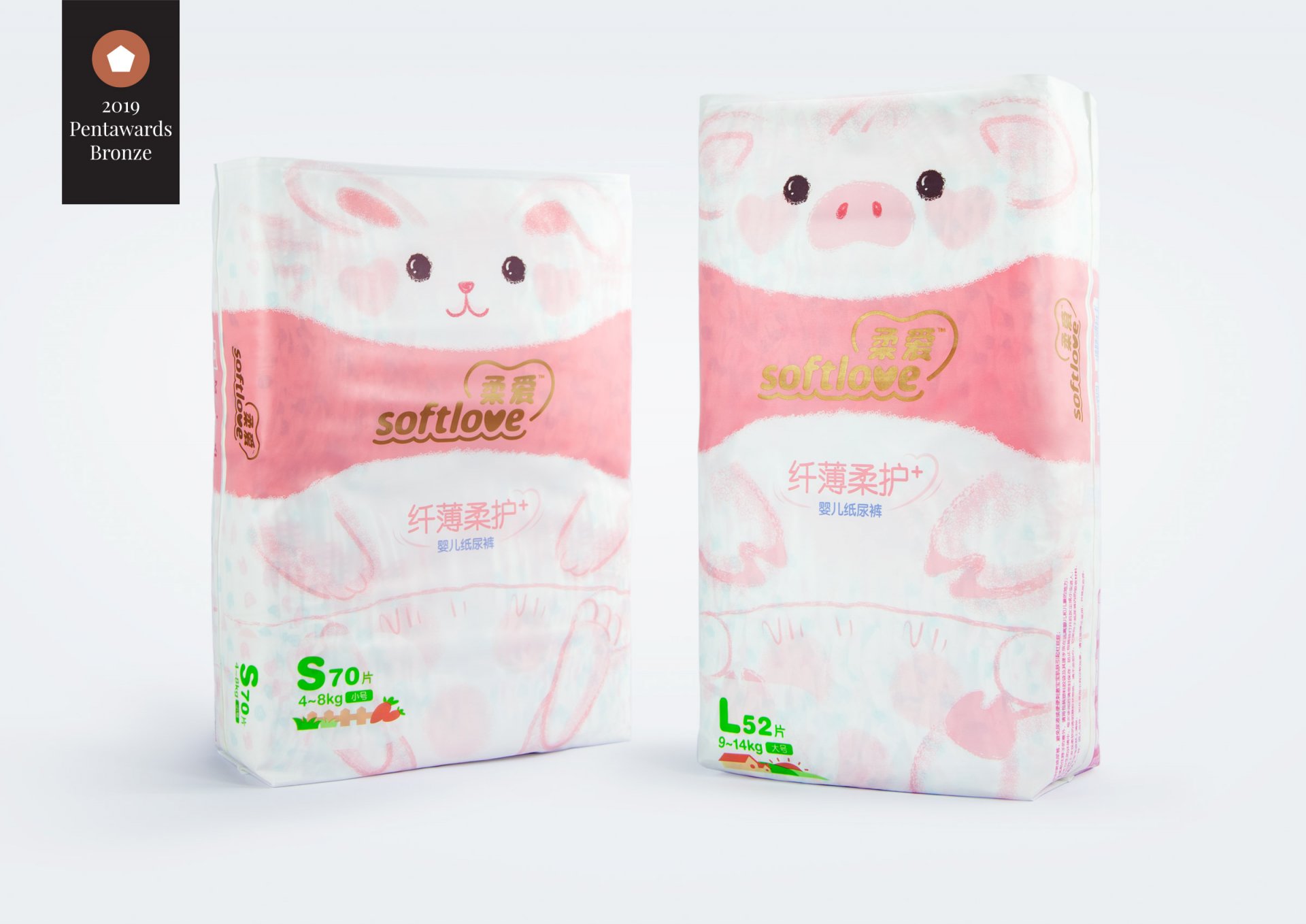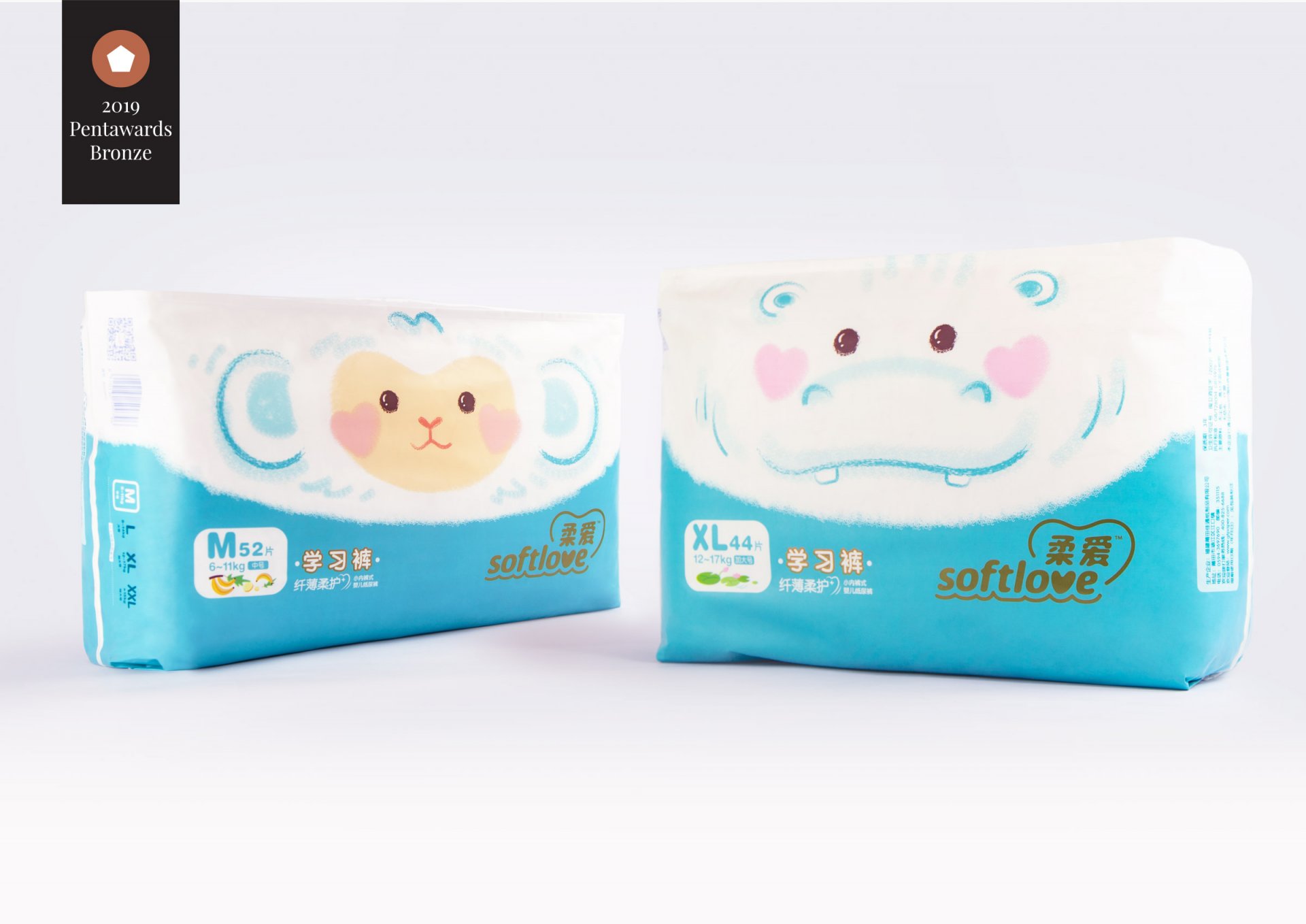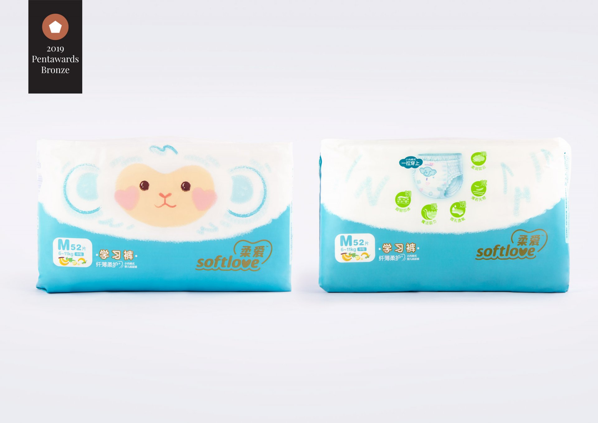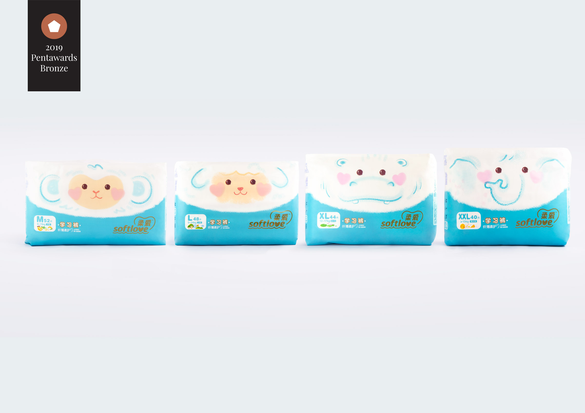 Softlove is a diaper and wipes brand focus on baby care, aiming to target new generation of young mother, the product image has been upgraded and to be more attractive. Box applied vary lovely animals to the new packaging of diapers and smart pants, and it feels softer and more comfortable by using crayon brush strokes. The whole packaging looks like a plush toy, which accompanies babies as a friend during their growth.