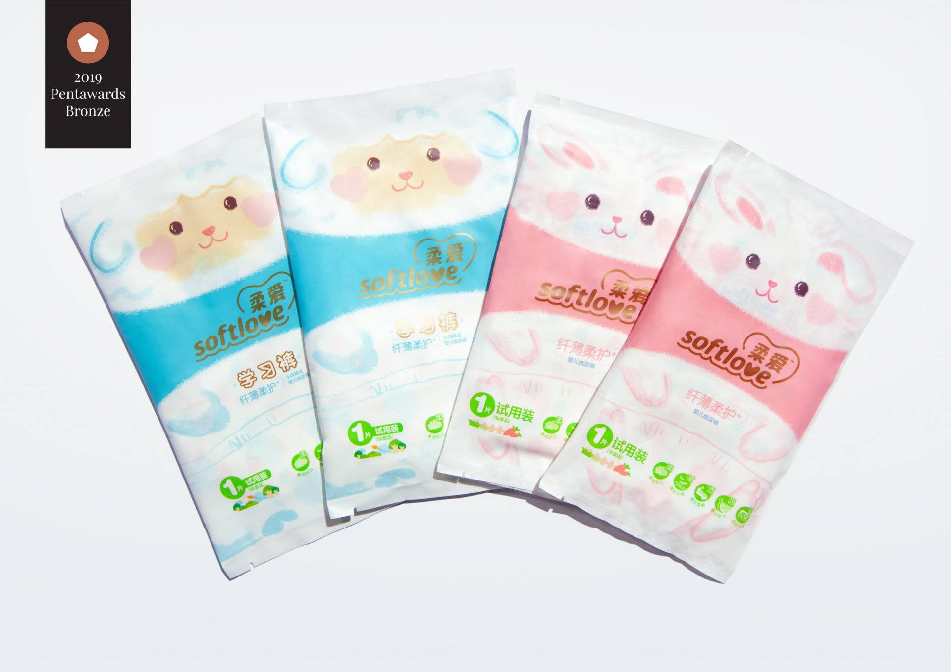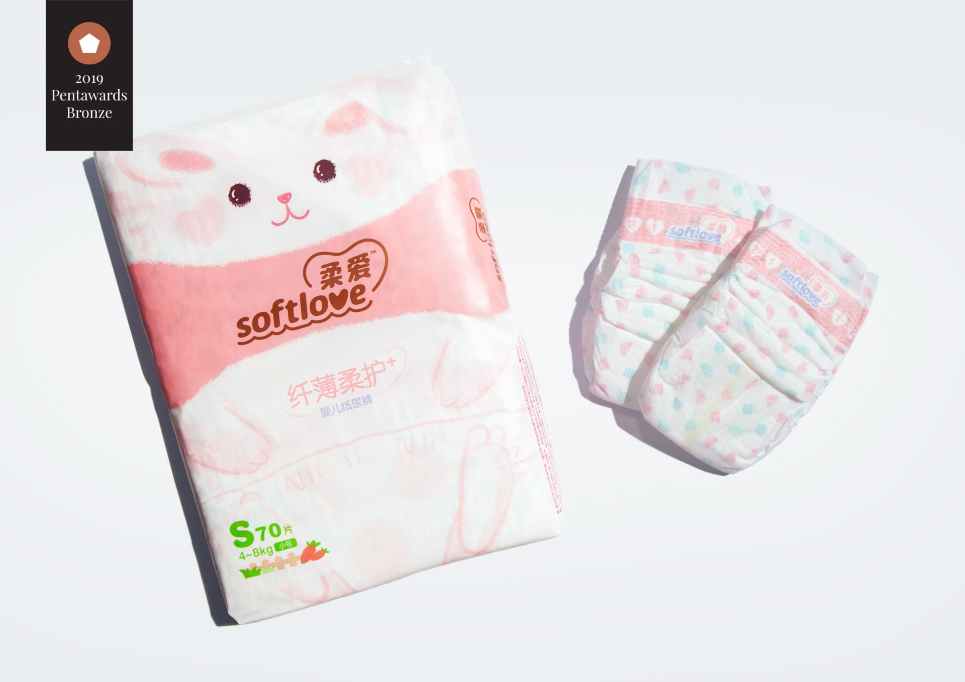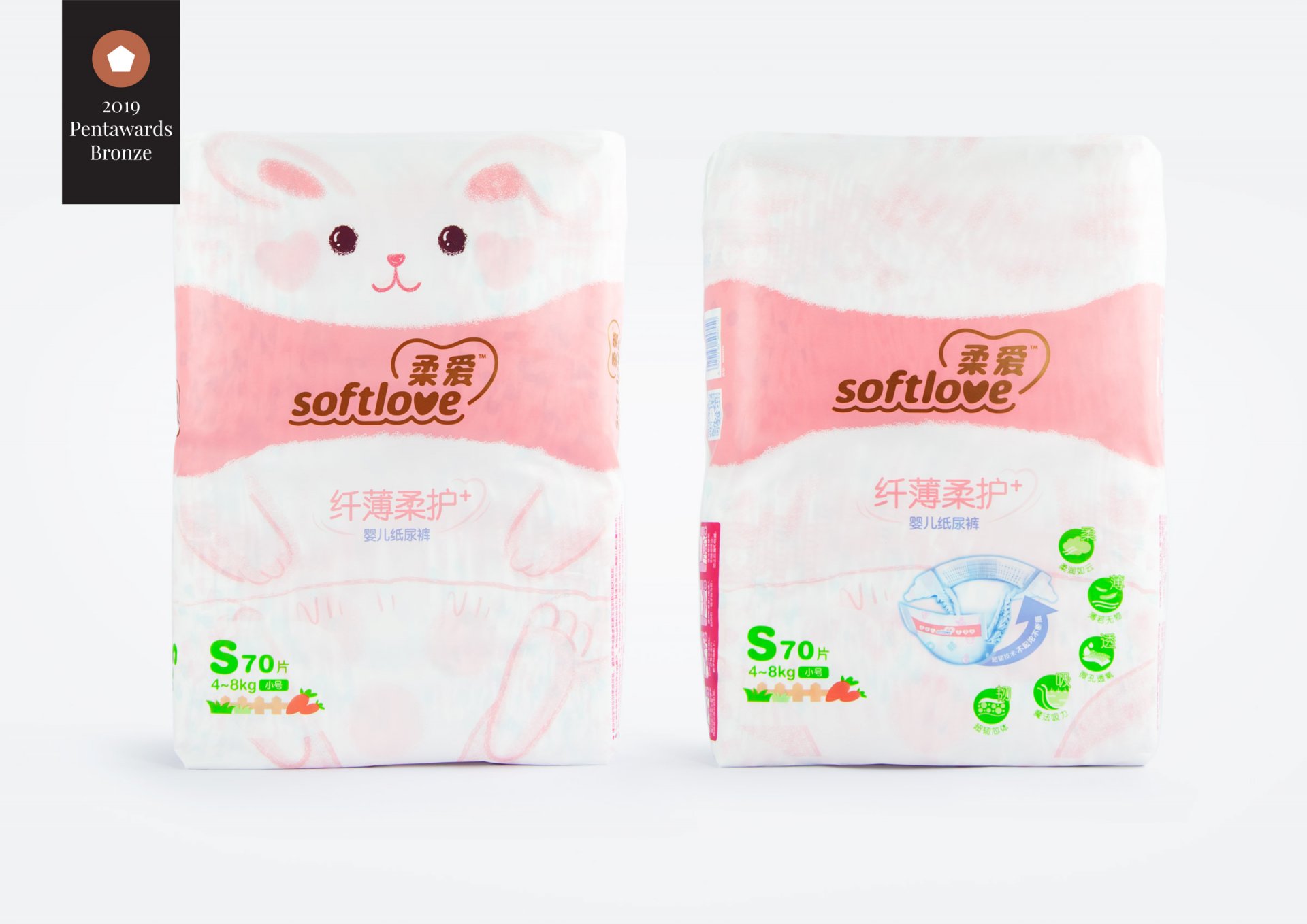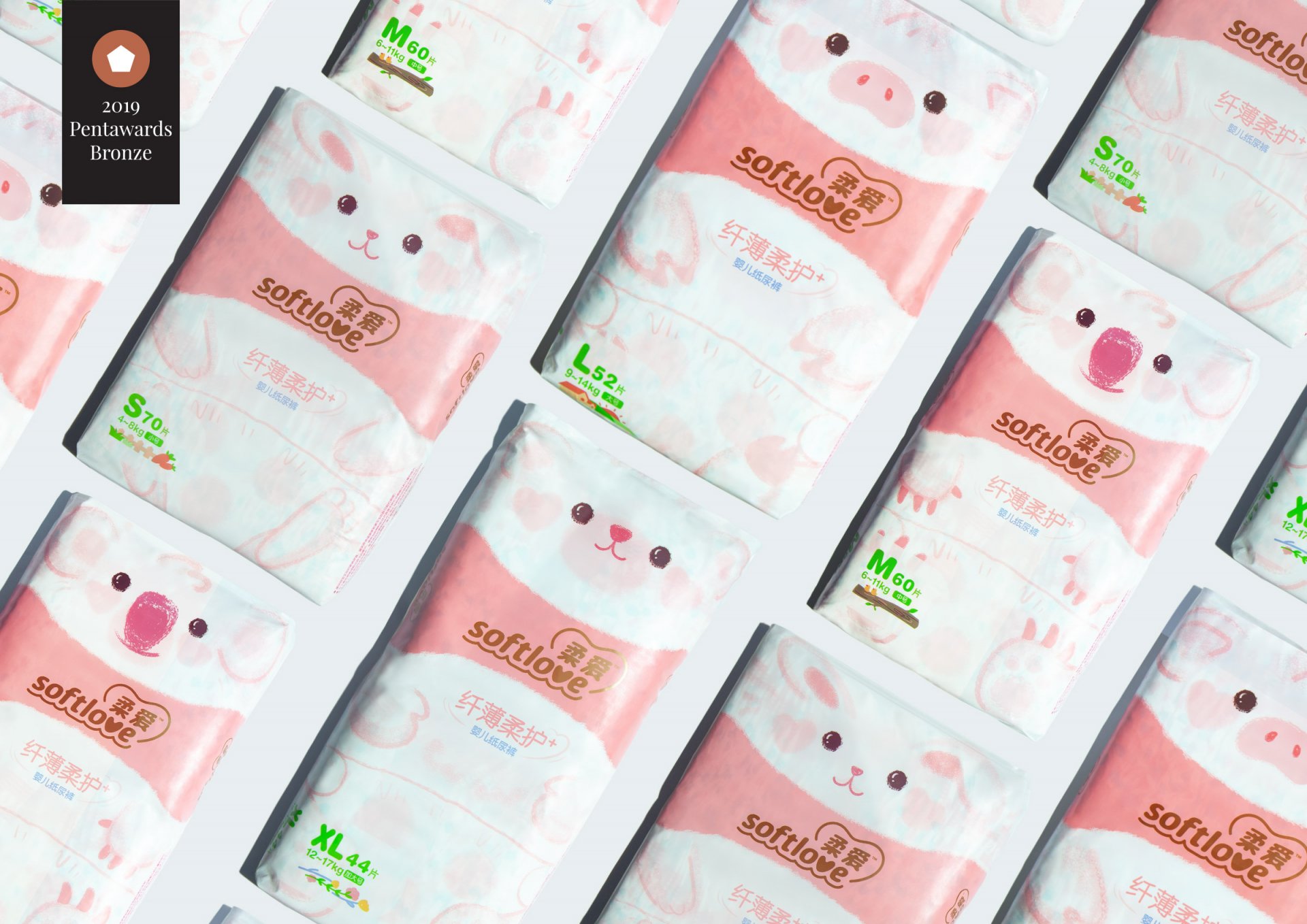 Softlove is a diaper and wipes brand focus on baby care, aiming to target new generation of young mother, the product image has been upgraded and to be more attractive. Box applied vary lovely animals to the new packaging of diapers and smart pants, and it feels softer and more comfortable by using crayon brush strokes. The whole packaging looks like a plush toy, which accompanies babies as a friend during their growth.
